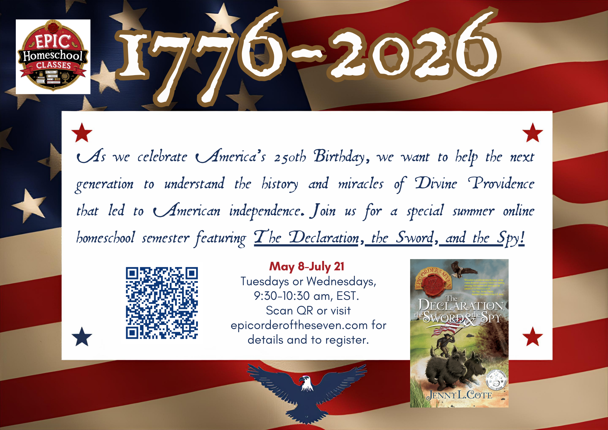 We are thrilled to introduce Epic Homeschool Classes offered online by instructor Beth Cuvelier (see attached Bio). Online instruction is open for students grades 6-12, and are 1/2 credit for History, Bible, and Literature for the semester. Older students will be given more difficult assignments, and if parents are interested, there is an Honors Option for these classes. Future plans will include all of Jenny's Biblical and American Revolution titles as courses.